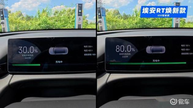 充电体验上,埃安RT焕新款支持3C快充,峰值功率可达150kW,经过我们的实际测试,30%到80%充电仅需21分钟,对比之下,秦L EV充电至同样电量则需要31分钟。