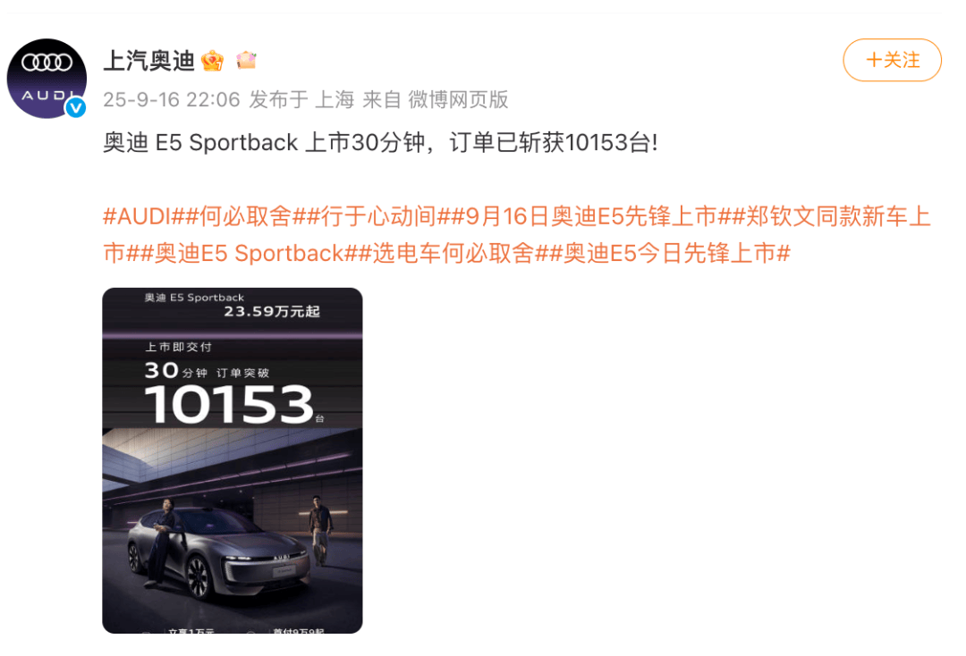 9月16日晚间,上汽奥迪宣布,奥迪E5 Sportback新车上市30分钟订单已达10153台。