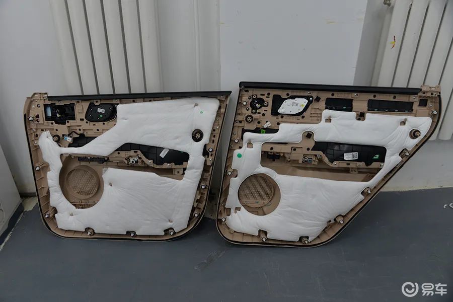 拆开车门内饰板,内部贴有大面积的白色原生隔音棉,并且是口罩级PP+PET双组分吸音棉。