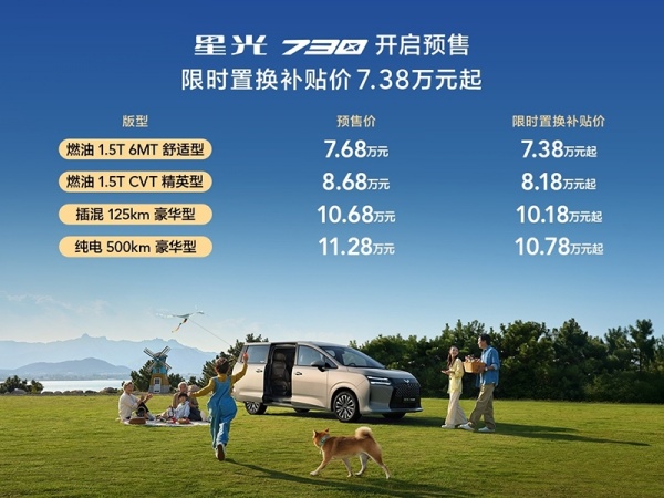 10月15日,五菱星光730开启预售,共推出4款车型,预售价7.68-11.28万,限时置换补贴价7.38-10.78万。新车定位全新七座MPV。