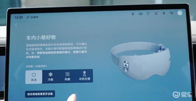 而至于小憩模式时戴的智能眼部按摩仪这些,就是按摩仪开机时,车辆就自动进入之前设定好的小憩模式,不用手去操作,便捷度明显提升。