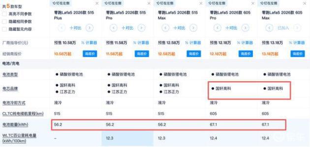 在外观和调校方面,零跑汽车做了不少介绍,例如Lafa5的底盘调校由零跑汽车和国际汽车巨头Stellantis集团的底盘团队联合完成。但在核心动力系统方面,Lafa5除了没有B01入门版的43.9KWH电池版本外,其余版本与B01的配置参数并无显著差异。