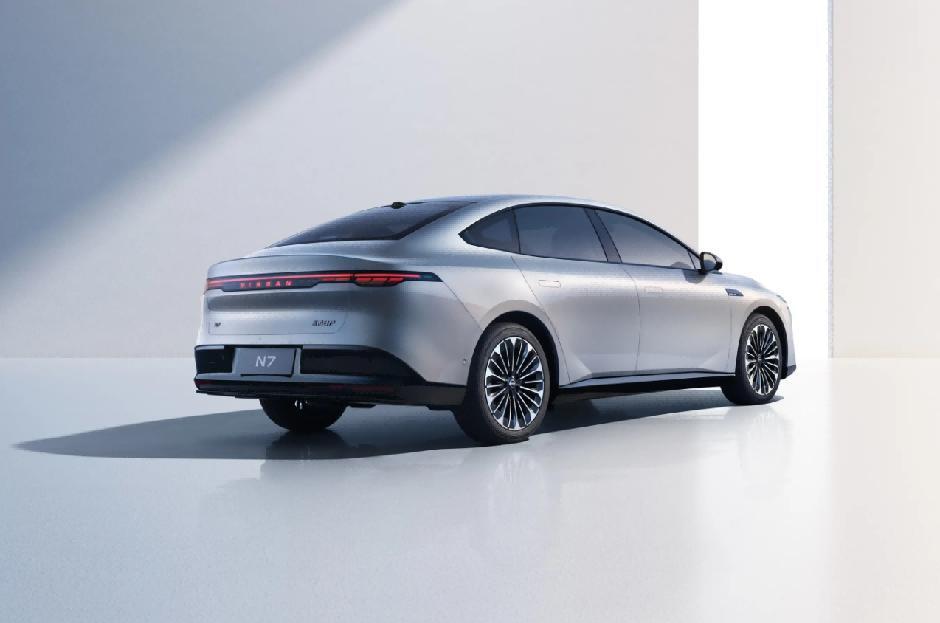 日产 N7 510Pro:基于天演架构打造,外观遵循简约纯粹的设计风格,配备 V-Motion 家族前脸与低风阻轮毂,全景天幕延伸至车尾,整体造型偏向家用车型的沉稳风格。