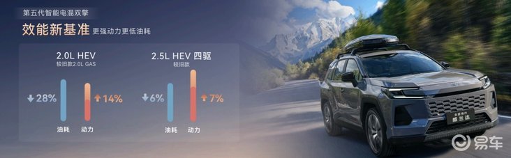 换代威兰达首次新增2.0L混动版本,较上一代2.0L燃油版油耗降低28%,百公里油耗低至4.59L,同级亏电油耗最低,动力输出提升14.3%,不充不换轻松驱动上千公里;2.5L HEV版对比上一代油耗降低6.1%,百公里油耗低至4.91L,动力提升6.8%,最大功率174kW,同级最高。不挑温度,不挑速度,全速域高效率、低油耗、强动力的换代威兰达,轻松满足用户短途长途多种用车需求。