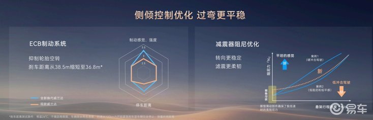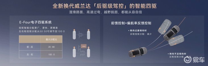 全新威兰达E-FOUR电子四驱可以罕见实现前后轴驱动力100:0-20:80的智能调节,动力系统通过对四驱系统和悬挂的智能调控,让这台城市SUV在保持舒适的同时,具备了超越同级的操控稳定性和通过性,过弯更灵活、脱困更迅速。应用全新ECB电子控制制动系统,轮上扭矩分配更快更精准,大幅优化侧倾控制,实现了更线性跟脚的制动脚感,显著缩短制动距离,过弯更稳。