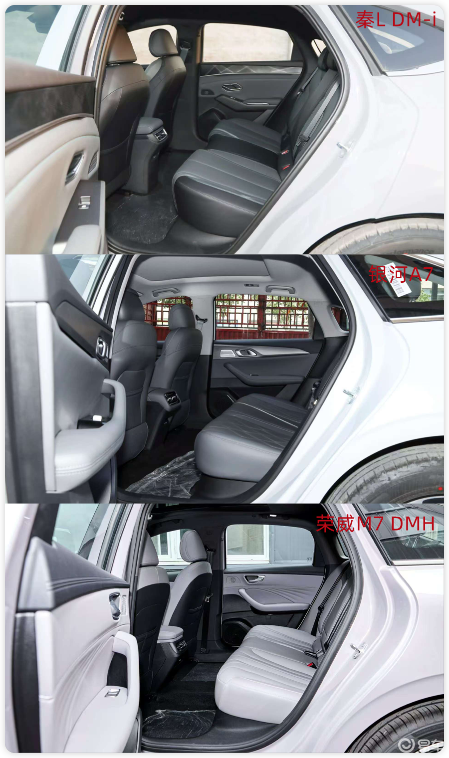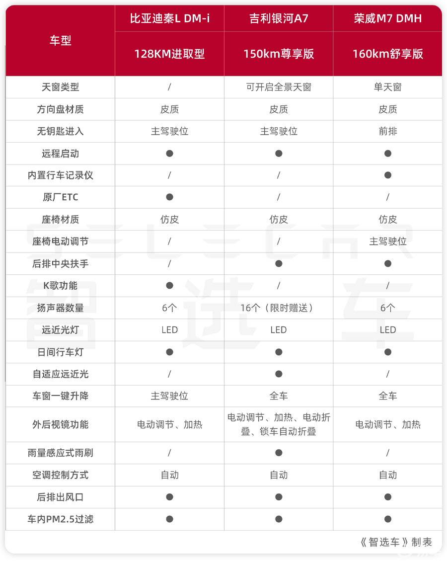 今天我们就拿2026款秦L DM-i 128KM进取型、2025款吉利银河A7 150km尊享版、2025款荣威M7 DMH 160km舒享版,这三款走量的主销版本,从大家关心的价格、空间、动力、配置等方面,聊聊这三款车该怎么选?