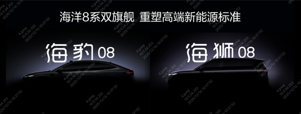 本次盛典的核心亮点之一,是海洋网全新高端旗舰系列“海洋8系”的车型名称正式揭晓——大型旗舰轿车海豹08与大型旗舰SUV海狮08,两款新车延续海洋网标志性的海洋美学设计语言,传承此前上海车展Ocean S概念车的设计理念,汇集比亚迪最新技术成果,将在电池安全、智能驾驶辅助、座舱交互体验、操控性能等维度实现全面升级,全方位满足用户对高端出行的多元化需求。据悉,海豹08与海狮08将于2026年第一季度正式亮相,进一步拓宽品牌产品覆盖维度。