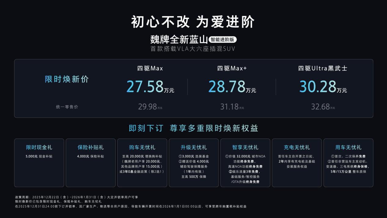 全新蓝山智能进阶版就像它的名字一样,智能化的进阶是最大的升级,新款新增了220V电源,外放电功率提升到了6kW,但取消了Carplay这一配置。智能化层面,VLA大模型上车了,搭配Hi4性能版四驱,也就堪称终极版的蓝山了。