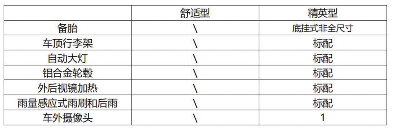 精英型多一个底挂式非全尺寸备胎,除了燃油版的舒适型,其他三款均标配车顶行李架和铝合金轮毂、自动大灯、外后视镜加热、雨量感应式雨刷和后雨刷有一个车外摄像头