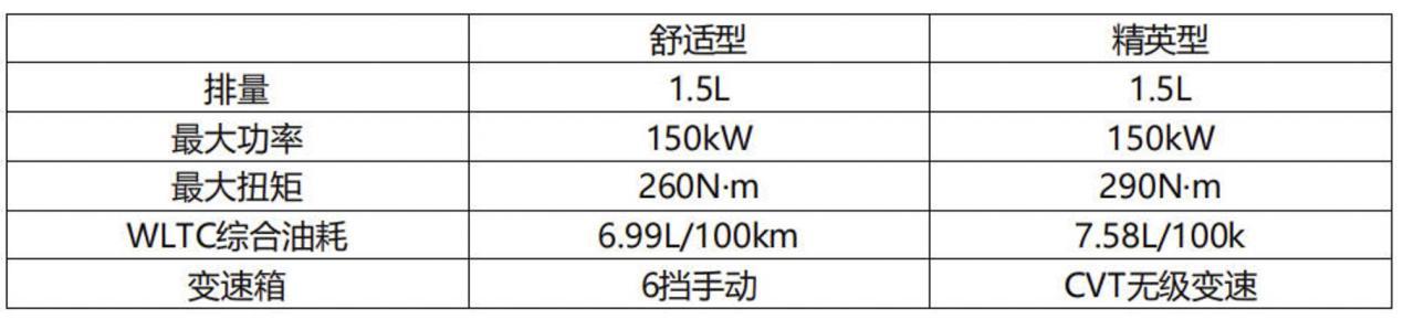 动力方面,两款燃油车的搭载的都是1.5T发动机,最大功率150kW,但是舒适型6档手动变速,精英型是CVT无级变速。舒适型最大扭矩260N·m,精英型290N·m,WLTC综合油耗也有差距,舒适型6.99L/100km,精英型略高,7.58L/100km。