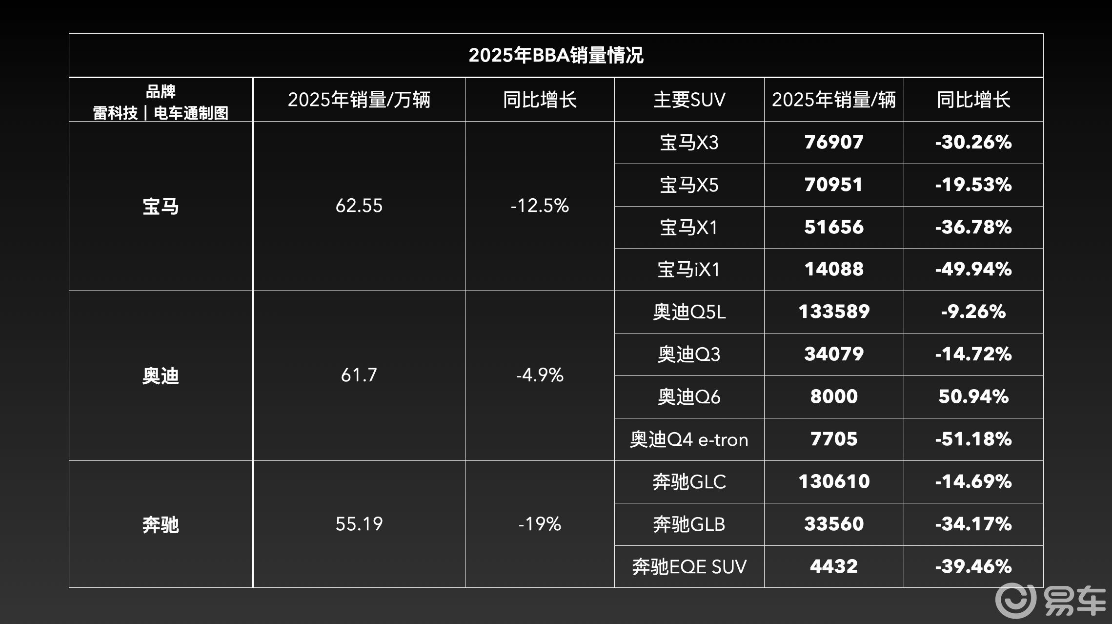 这并不是电车通危言耸听。曾几何时,BBA在中国市场如日中天,年销70万辆是家常便饭,但去年BBA三家销量集体大幅跳水,最令人唏嘘的莫过于奔驰,不仅年销量跌至55.19万辆,更惨遭奥迪反超,昔日的王者光环瞬间黯淡。