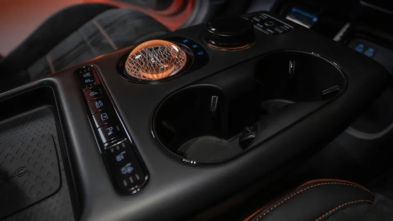 内饰采用哥特式全黑设计,搭配标志性的 Magma 橙色装饰线条,形成强烈的视觉对比。座椅、车门和中控台均采用高端翻毛皮材质包裹,橙色对比缝线贯穿其中,彰显高性能属性。专属运动方向盘配备醒目的橙色按键,可一键切换驾驶模式和激活增压功能,27 英寸全景中控屏在激活 Magma 模式后,驾驶员视野区域会切换为三环仪表布局,实时显示车速、电机和电池温度、G 值等核心驾驶数据,让驾驶者专注于操控。