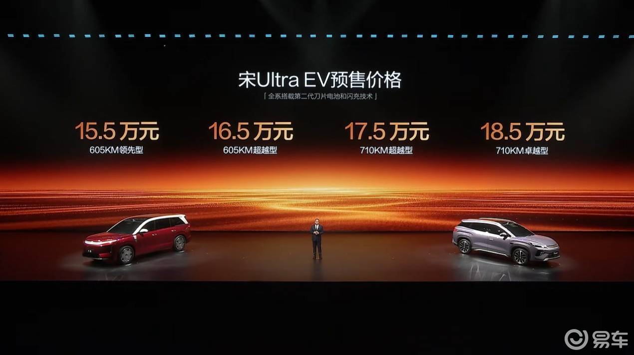 宋Ultra EV 预售15.5-18.5万元纯电续航710km,可选装天神之眼B辅助驾驶激光版,云辇-C。预售期间送18个月的闪充权益。