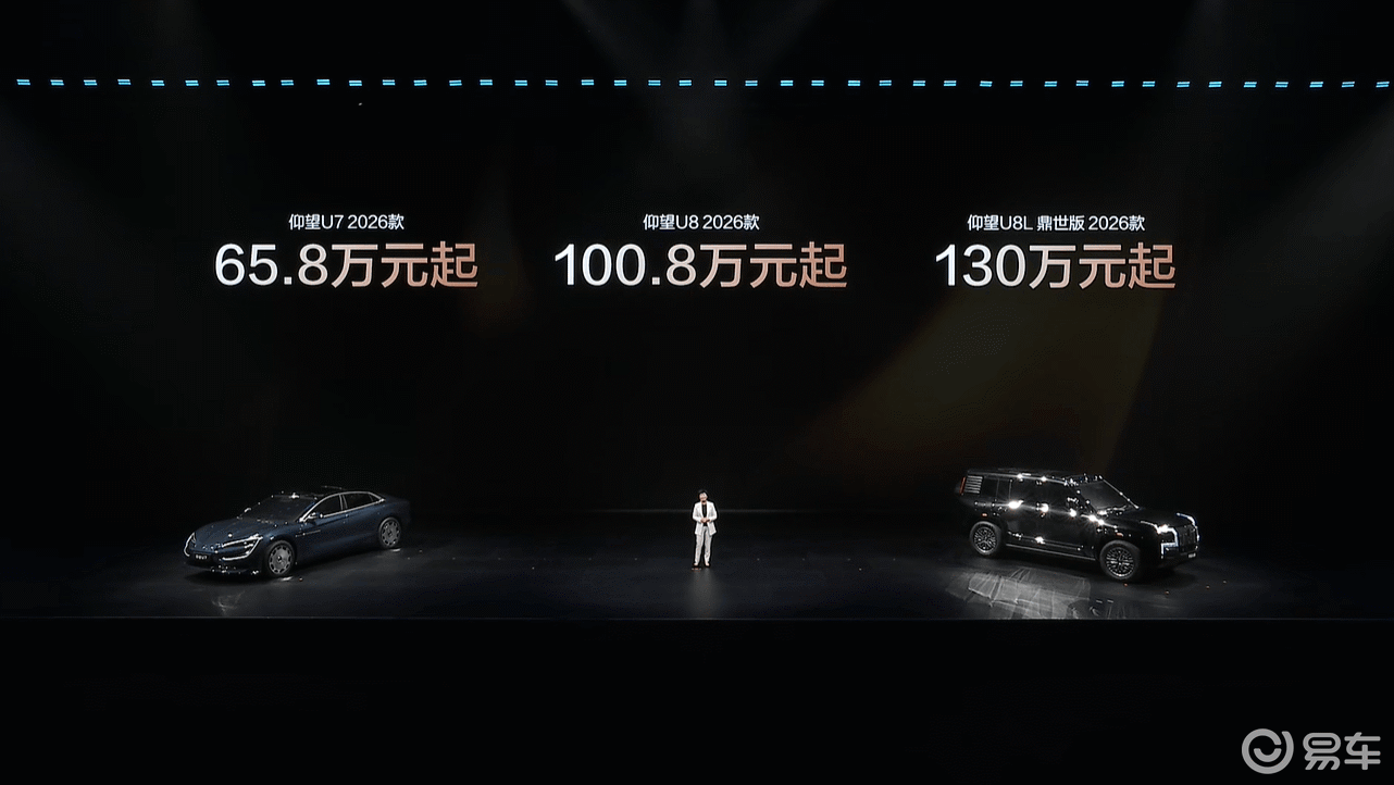 仰望:2026款仰望U7/U8/U8L鼎世版三车齐发,售价分别为65.8万起、100.8万起和130万起。