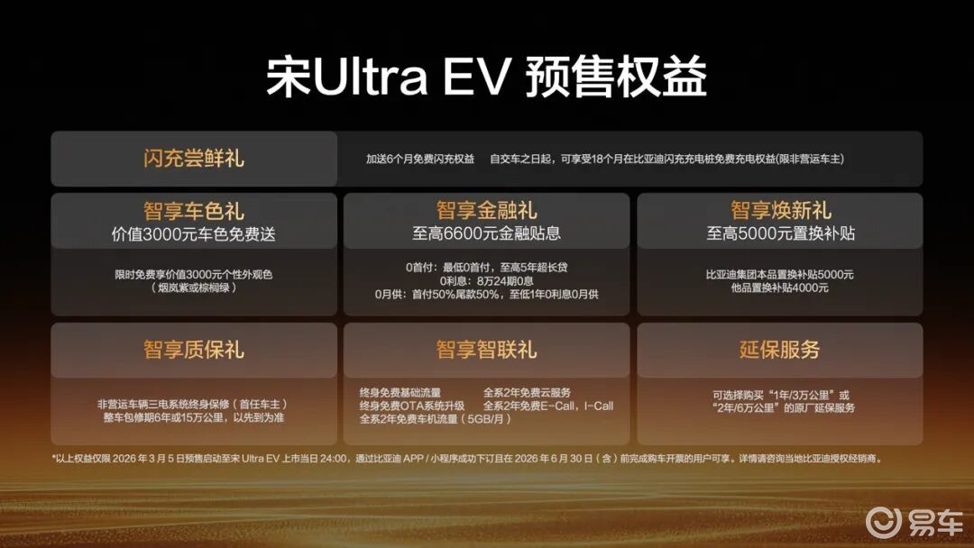 同时,宋Ultra EV推出丰厚预售权益,预订用户可享18个月免费闪充、至高6600元金融贴息、至高5000元置换补贴、价值3000元个性车色免费送等福利,非营运车辆首任车主还可享三电系统终身保修。
