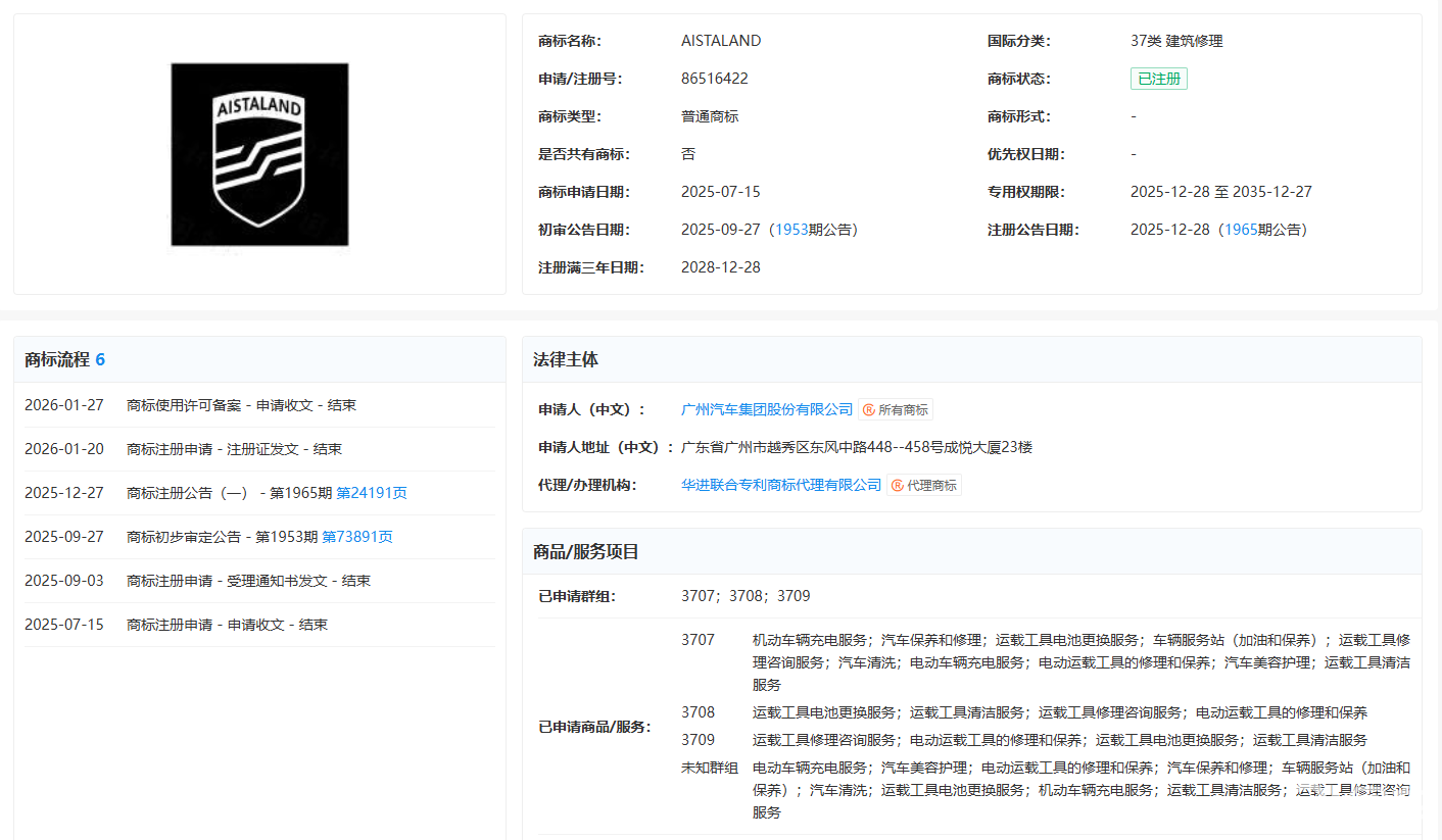 其次,启境的英文名是AISTALAND,源自于AI STAR NEW LAND,“AI启新境”的翻译。虽然这次没有发布Logo,但实际上广汽提交了一个盾形Logo、里面是赛道旗的样式,新Logo也已经通过了商标注册,预计在新车上市的时候会一起发布。
