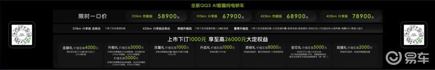 与瑞虎7L同台亮相的,还有一代“国民神车”全新QQ3。新车此前已斩获盲订超6万台、预售超4万台的傲人战绩,此次区域上市备受瞩目。全新QQ3推出310km、420km两种续航版本共四款车型,官方上市价5.89万元起。上市期间下订1000元可享至高26000元大定权益,涵盖金融礼(限时享至高7万36期0息(贷款五年前三年还款可免息);5万24期0息)、升舱礼(热爱版免费赠送540全景影像及后视镜加热,分享版赠送电动前备箱及自动泊车辅助)、流量礼(终身免费基础流量加赠2年娱乐流量)、升级礼(终身免费OTA升级)、质保礼(整车及三电终身质保)、安芯礼(动力电池衰减超过30%可免费更换电池,首任非营运车主电池自燃赔新车)及救援礼(终身免费道路救援)。