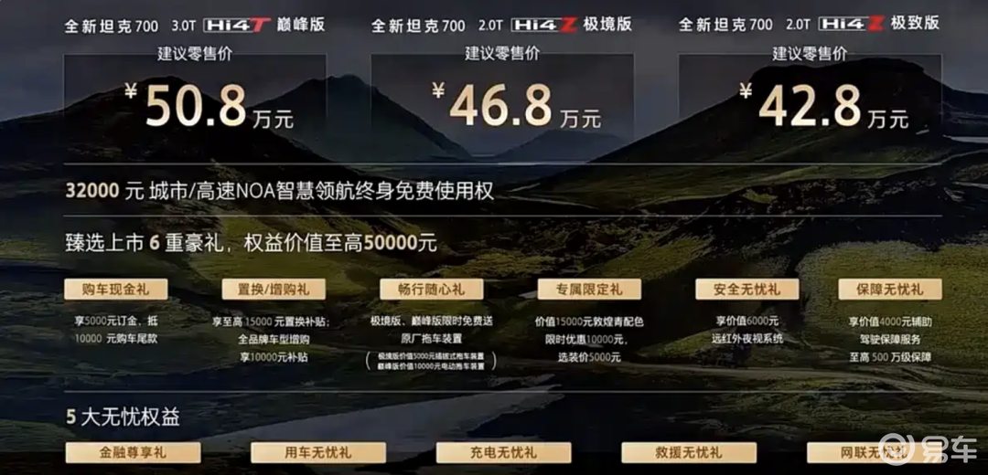 作为展台的绝对主角,全新坦克700此前已在4月20日正式上市,共推出2.0T Hi4-Z极境版、极致版与3.0T Hi4-T巅峰版三款车型,官方指导价42.8-50.8万元,用覆盖城市通勤、长途穿越、极限越野全场景的产品矩阵,满足不同用户的高端越野需求。